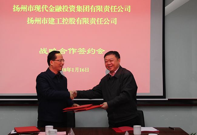 1月16日下午,揚州建工控股有限責任公司與揚州市現(xiàn)代金融投資集團有限責任公司(下稱“金融集團”)舉行戰(zhàn)略合作簽約會。公司董事長王宏、副總經理程杰,金融集團董事長龔振志、總經理劉研等出席簽約會。
