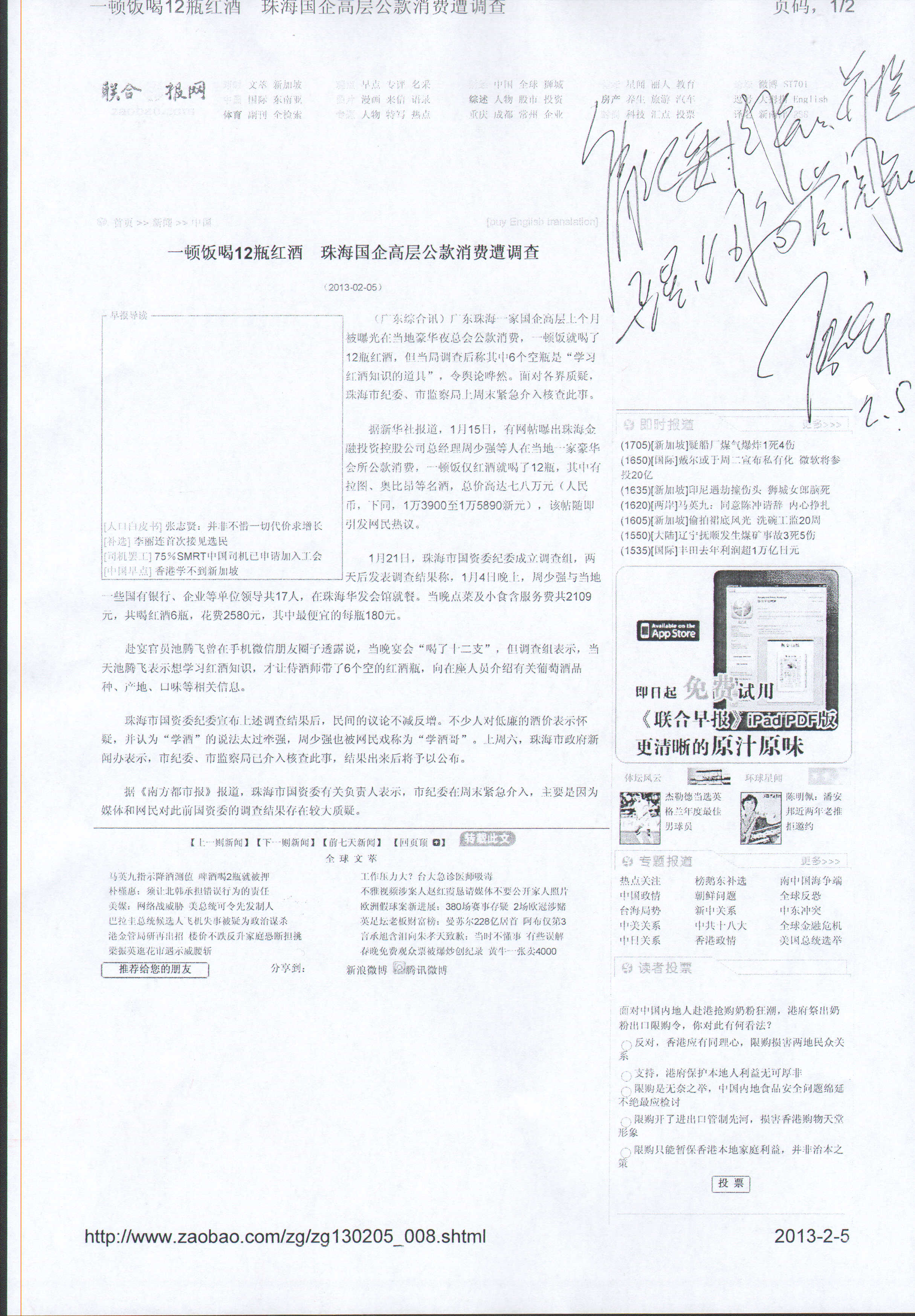 陸金龍董事長對網載“珠海國企高層公款消費”作出批示,提醒公司高管引以為戒 時間:2013-02-065577 陸金龍董事長對網載“珠海國企高層公款消費” 作出批示,提醒公司高管引以為戒 2月5日聯合早報網登刊信息“一頓飯喝12瓶紅酒 珠海國企高層公款消費遭調查”,陸金龍董事長即日批示:“請紀委閱知,并提醒公司高管閱知”。公司紀委、紀監室也當即將此精神向公司上下作了傳達,要求嚴格按公司廉政細則十二條辦事,如有違犯將層層追究責任。